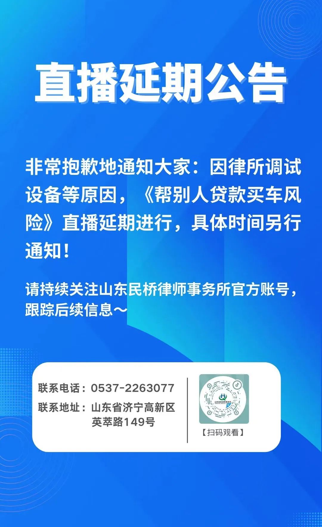 山东民桥律师事务所抖音直播延期公告