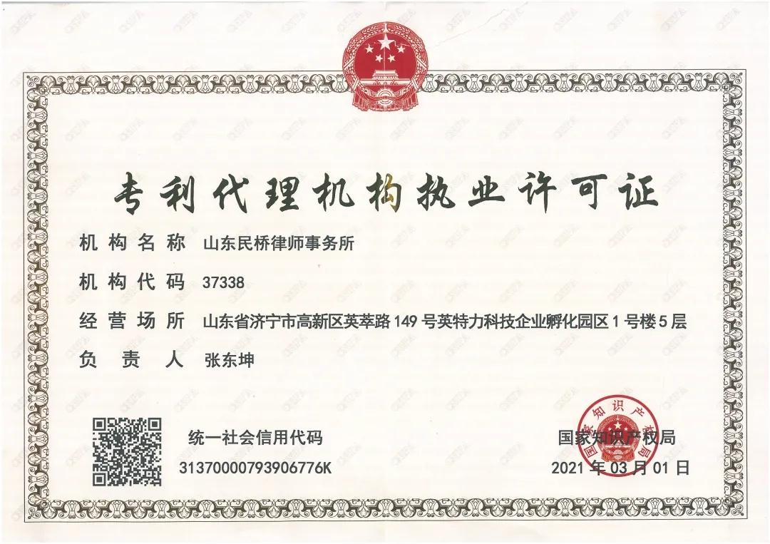 山东民桥律师事务所获得专利代理机构执业资质